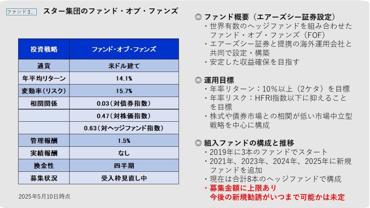 長期の運用実績のあるヘッジファンドの中から、当社と海外パートナーで安定的で長期的に投資額が成長する最適なファンドのポートフォリオを決定します。当初は4本からのスタートでしたが、コロナショックや世界経済動向の変化で、現在は8本のヘッジファンドに分散投資をして、10年で2倍になるような投資成果を目指すファンド・オブ・ファンドです。条件付きで5万米ドルからの投資も可能です。